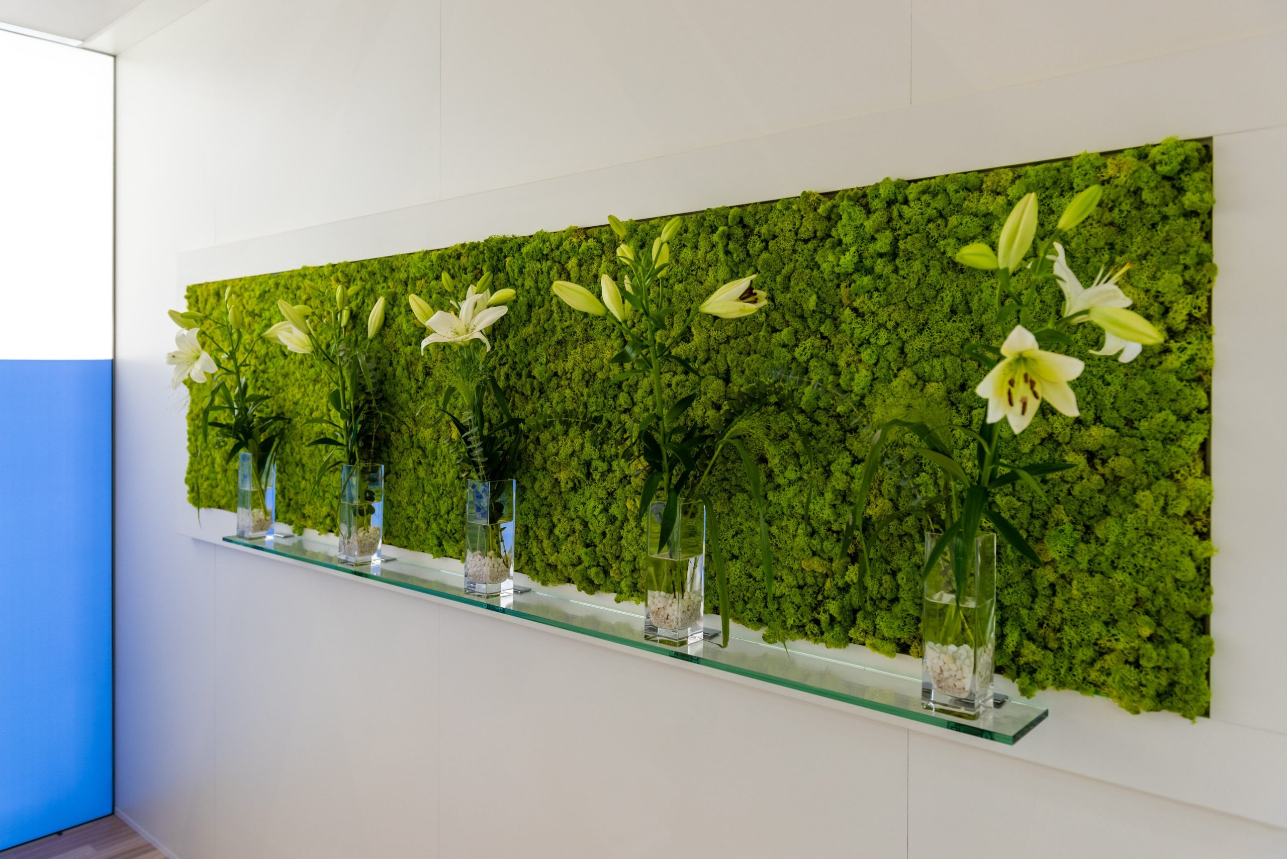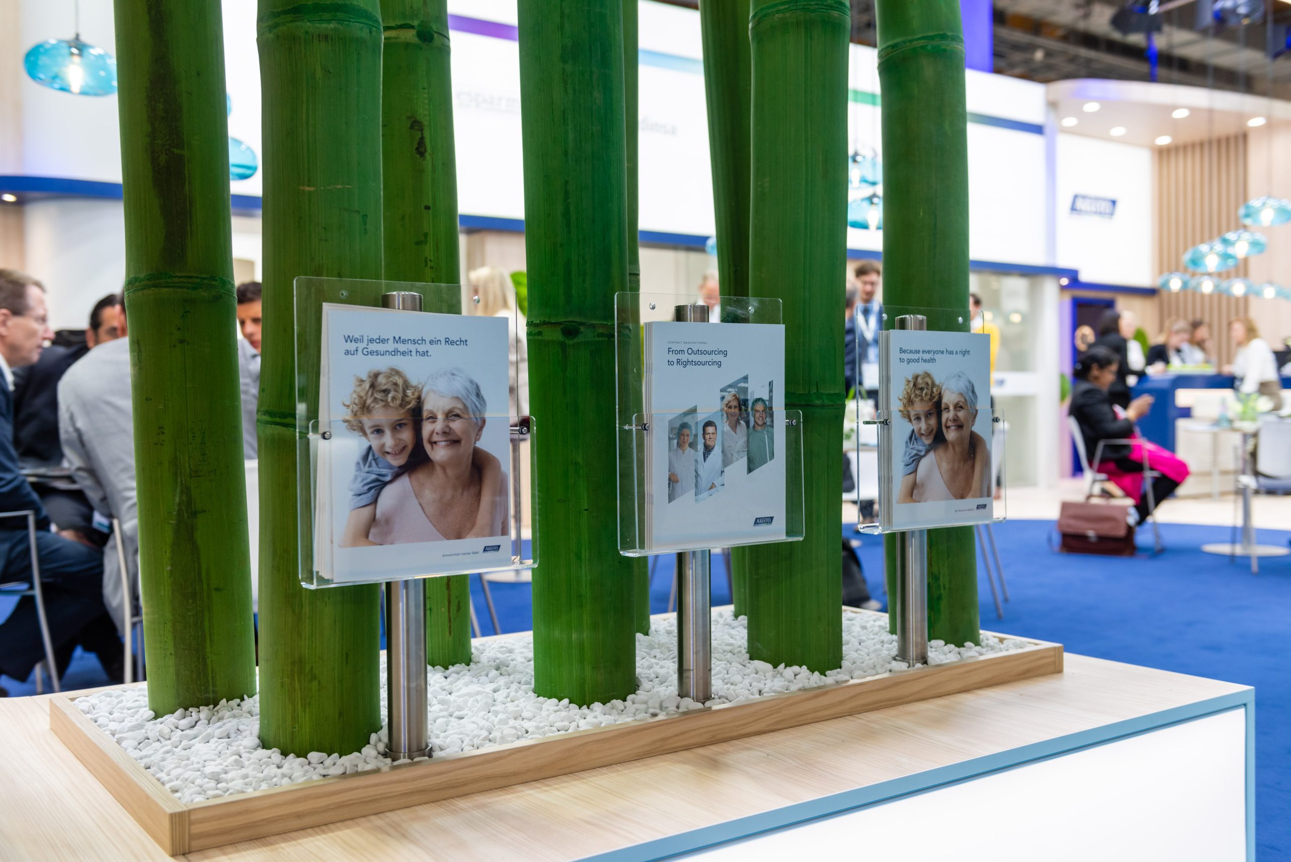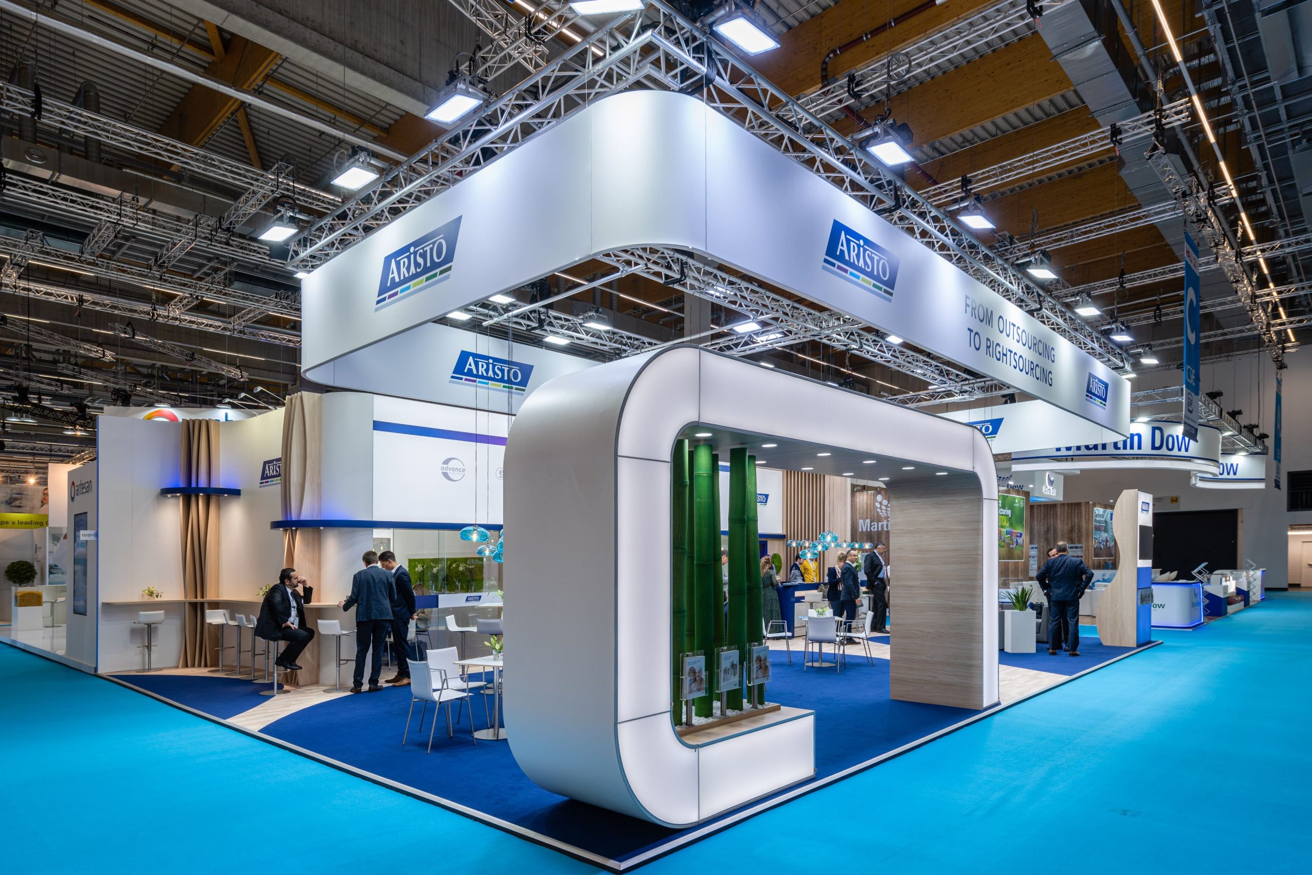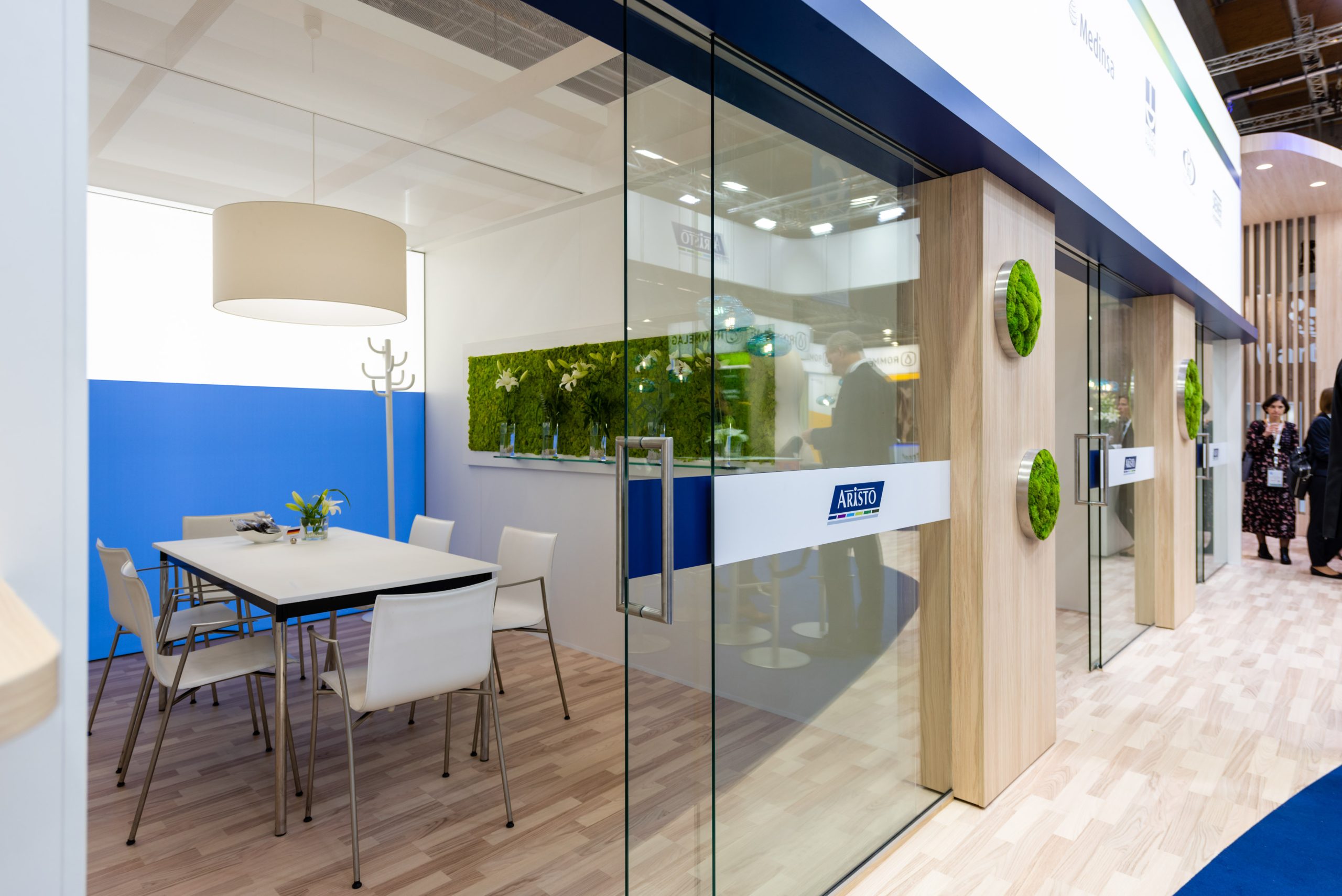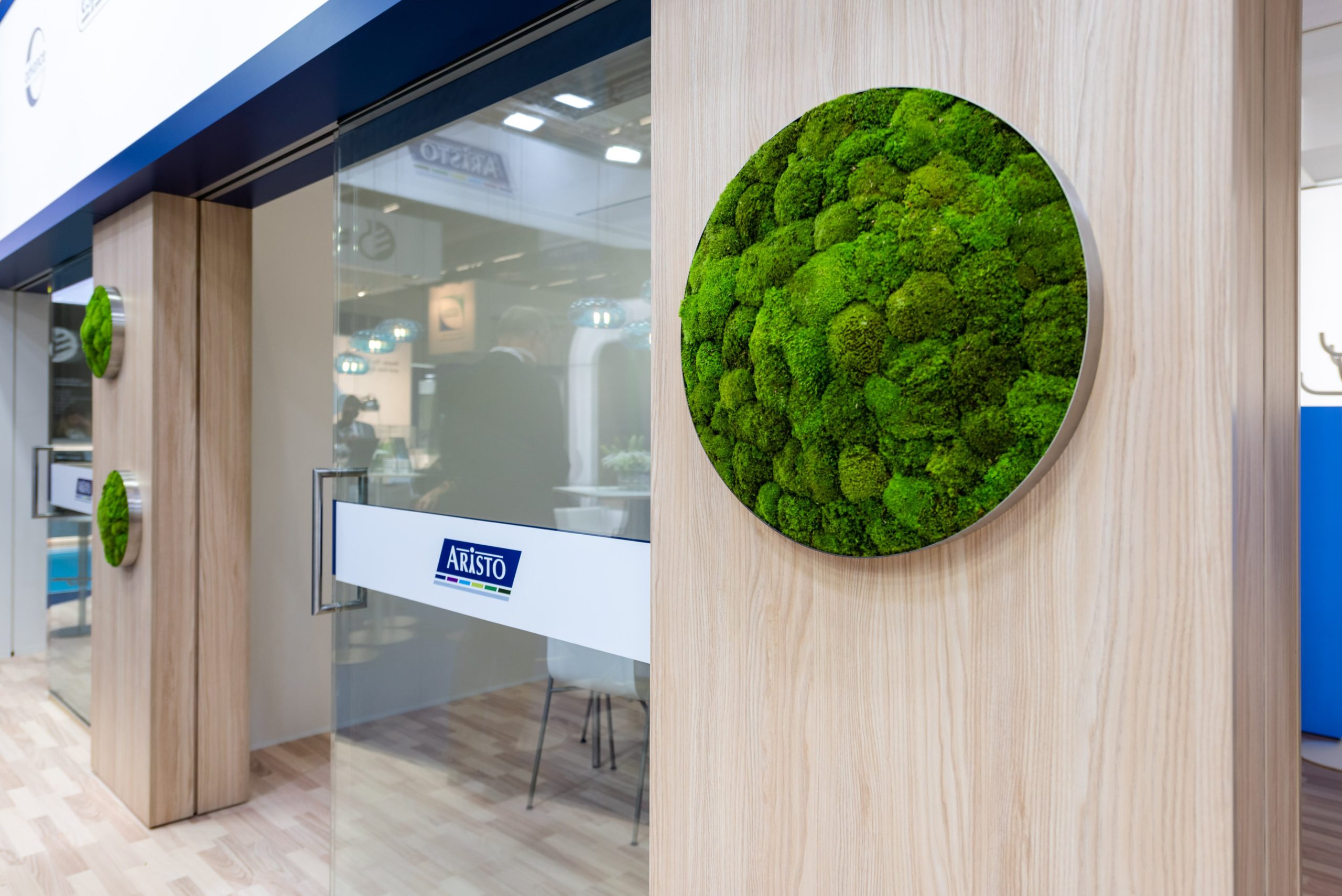 At the Aristo Pharma booth, functionality harmonizes with design, featuring bamboo accents in round, non-intrusive walls and a floor blending corporate colors with wooden parquet. Three conference rooms adorned with real moss and elegant white plants create a serene ambiance, with moss serving as a natural decorative element throughout the stand.