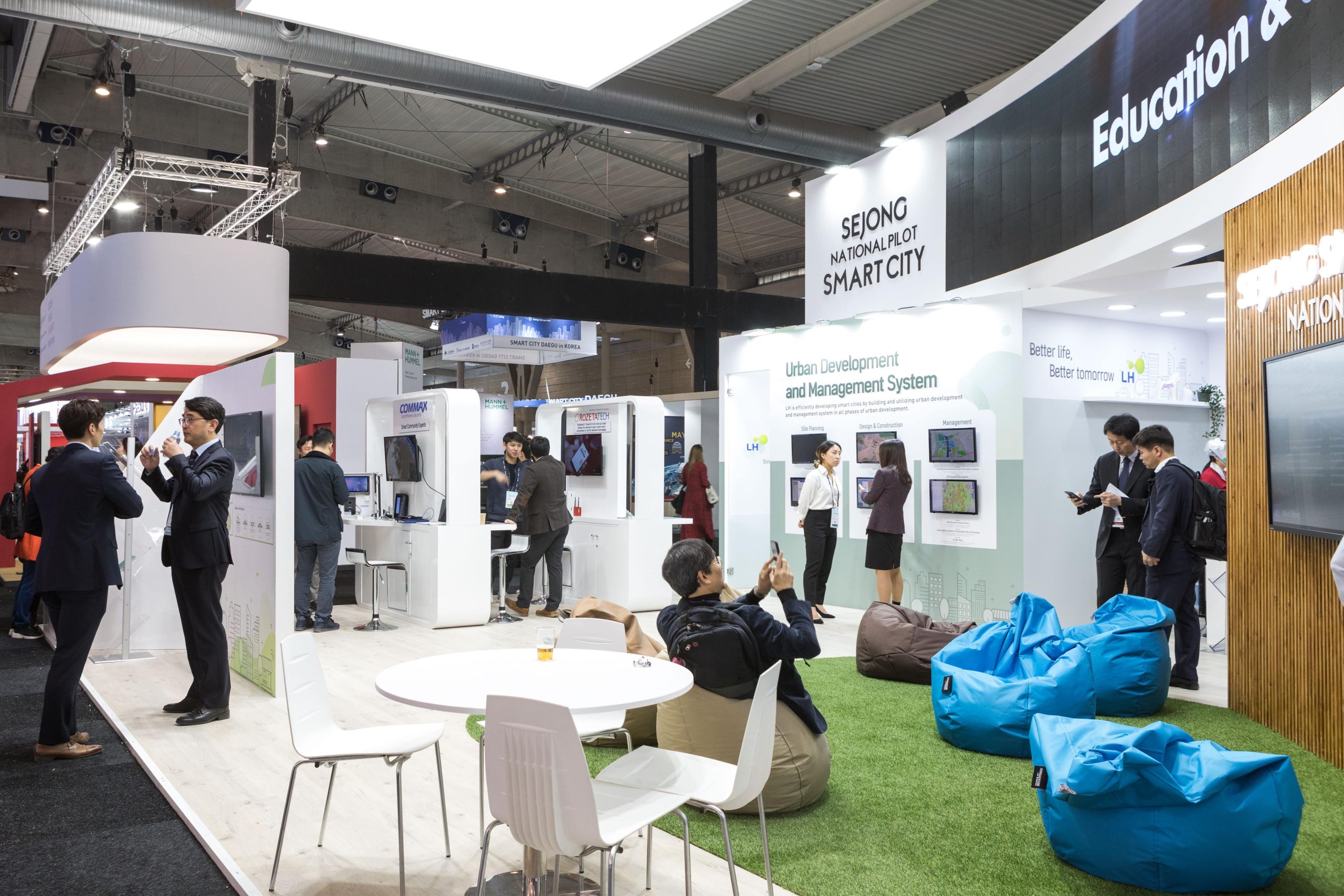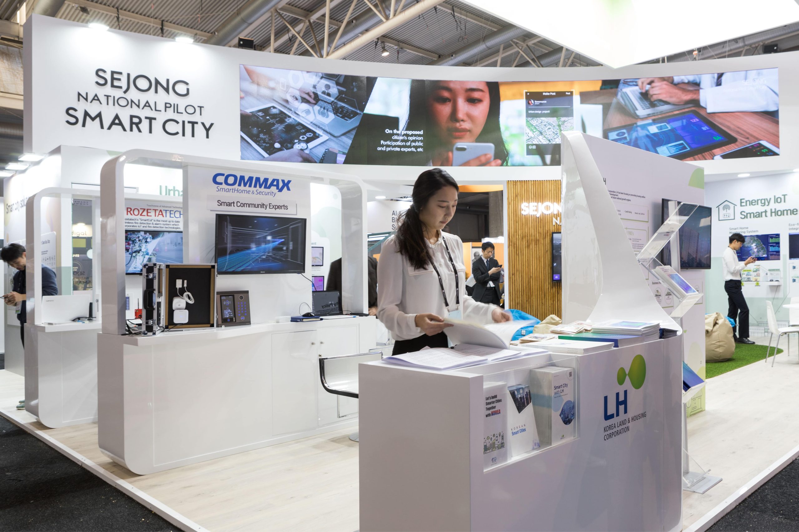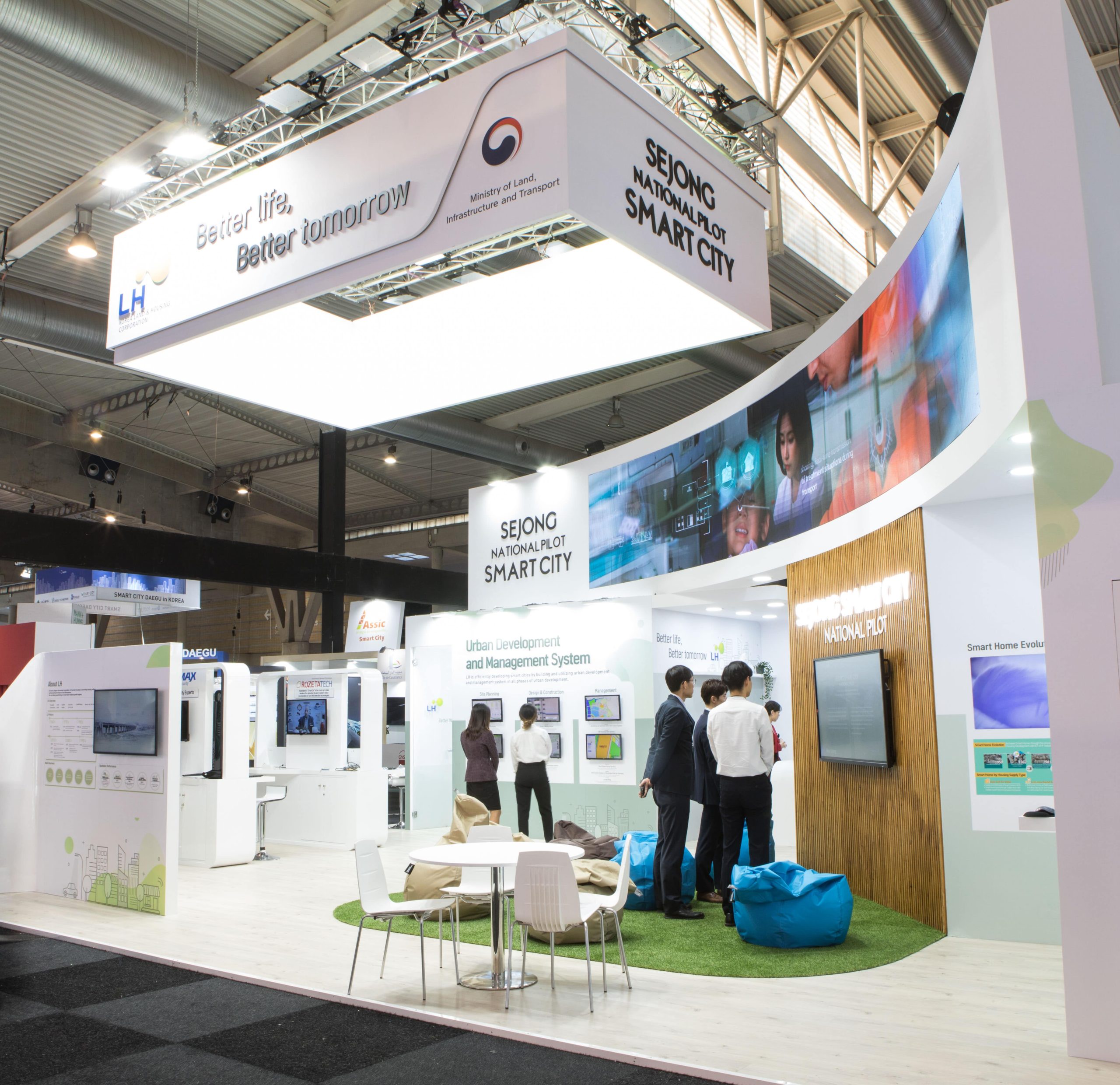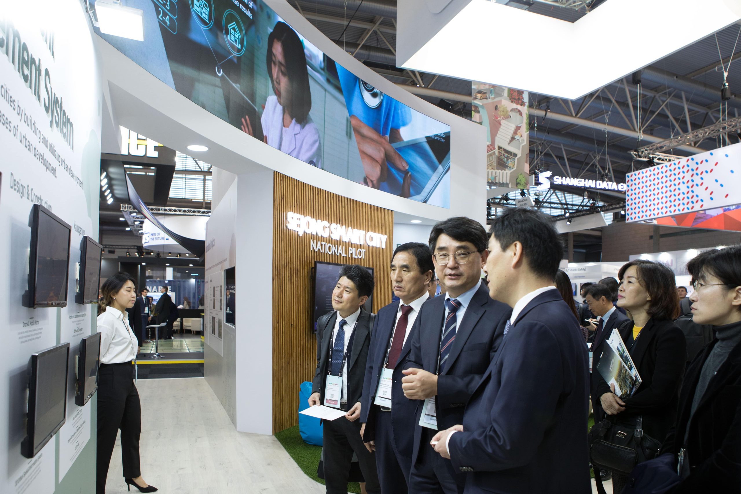 Sejong National Pilot showcased Korea's Smart City Solutions within a clean, wooden-painted finished stand. The focal point was an 8-meter-long curved LED wall, captivating visitors and effectively communicating the value proposition of the company.
